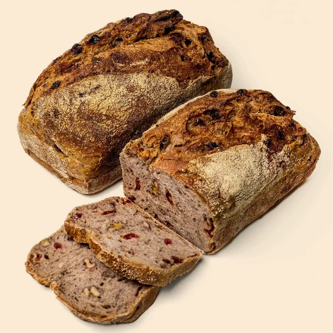 Baked with crunchy walnuts and sweet cranberries inside the sourdough; naturally fermented for that rich taste, it’s an easy loaf to snack on, especially with cheese.